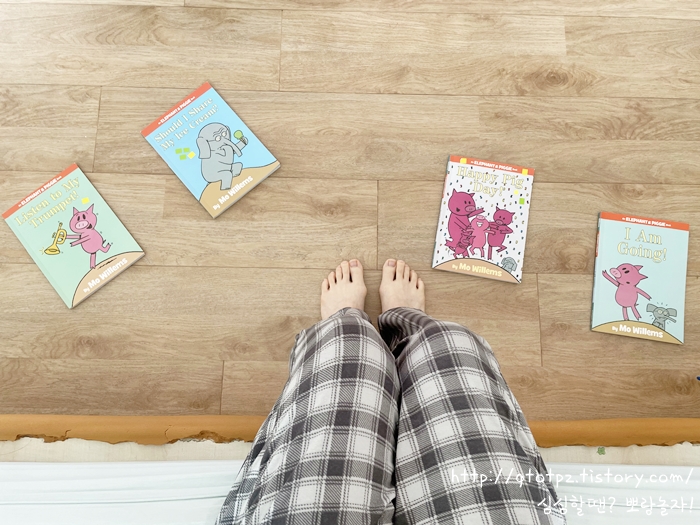 오복이가 스스로 한글을 읽을 수 있게 된 후로 제가 할 일이 없었어요. 먼저 "읽어줄까?" 물으면 그닥 내키지 않아하고, 본인이 눈으로 빨리 읽어버렸죠. 글밥이 좀 되는 책이나 되어야 옆에 앉아 들었어요. ㅋ 사실 좀 편하면서도 섭섭하기도 했어요. 한글을 너무 빨리 떼버려서 시원섭섭한 느낌이었죠. 헌데 엘리펀트 앤 피기 요 시리즈 보면서 같은 책 보며 웃는 경험을 다시 했습니다. ㅋㅋ 엄마와 살 부비는 애착 시간을 만들어줬어요.