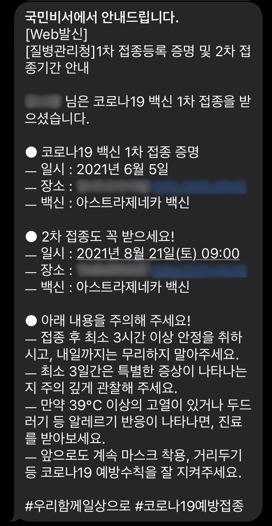 병원을 나설 때 국민비서라는 이름으로 질병관리청의 문자가 왔어요. 코로나19 백신 1차 접종 내역과 2차 접종 계획까지 잡혀있었습니다. 우선 접종 대상이 아니라 제 순서가 오려면 한참 있어야 했는데 2차 접종까지 잡혀있으니 이보다 더 든든할 수 없습니다. 대한민국 사람들 빨리빨리 좋아하잖아요? 저도 어쩔 수 없는 한국인인가 봐요. 이거 했다고 기부니가 좋습니다. ㅋㅋㅋ