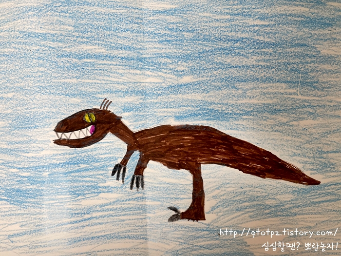오복이가 돌봄교실에서 나올 때 뭔 종이를 손에 들고 있었어요. 가만 보니 공룡 그림! 이거슨 오복이의 화풍이 아니라 물어봤더니 친구가 그려 줬대요. ㅋ 그럼 그렇지. ㅋㅋㅋㅋㅋㅋ 엄청 잘 그렸더라고요. 우리 오복인 "남자들은 왜 공룡을 좋아할까?" 이러고 있고 아무 생각이 없습니다. ㅋㅋㅋㅋㅋㅋ