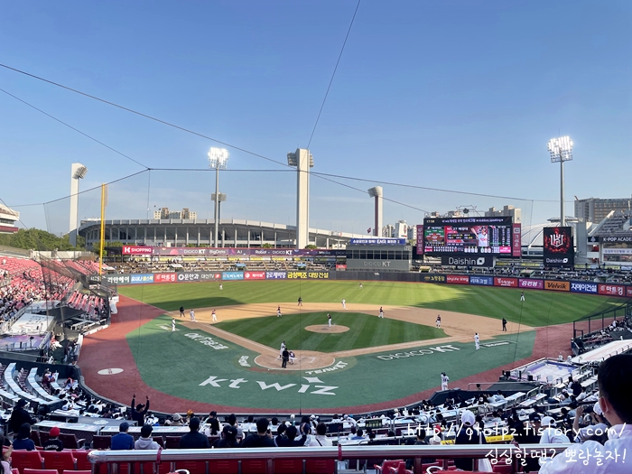 지난 주말에 야구장 다녀왔어요. 아주 어렸을 때 삼성 라이온즈 직관하러 대구 구장 다녀온 적이 있어요. 야구 좋아하시는 할아버지 모시고 갔던 걸로 기억해요. ㅋ 저는 딱히 좋아하지 않아서 다시 갈 일이 있으려나 했는데 생각지도 않게 오복이 학원에서 단체표가 나왔어요. ㅋㅋㅋ 그래서 수원 KT 위즈파크에서 키움 vs KT 경기 보고 왔습니다.