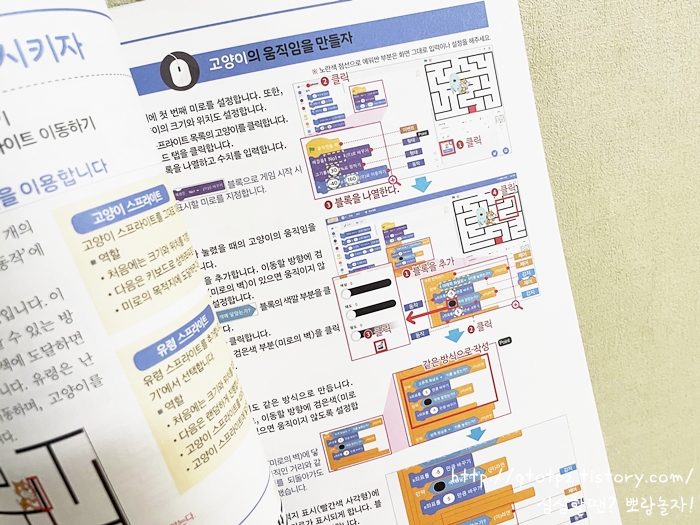 [부모와 자녀가 함께 그림으로 보는 스크래치 코딩]은 코딩을 처음 접하는 누구나 따라하면 성과가 나오는 방식으로 되어있다. 단계별로 이미지가 있어서 인내심만 있으면 될 듯. 나는 뭘 배울 때 영상강의도 좋지만 책이 있는 걸 선호하는데 스크래치와 이 책은 온오프라인의 완벽한 조화가 아닐까! 내가 이 책을 보고 있으니 오복이가 오랜만에 코딩이 하고 싶다며 기웃거렸다. 일단 책을 한 번 훑어보자고 했는데 음, 그 말이 흥미를 떨어뜨린 것 같다. 현실적으로 시간 여유가 없기도 해서 방학 때 같이 할 생각을 하고 있다. 따라 하는 것을 넘어 오복이 스스로 뭔가 만들어내면 매우 뿌듯할 듯!