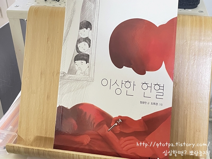 '이상한 헌혈'을 우리 예비 초5에게 읽어보라고 권유해 보았습니다. 보자마자 표지가 무섭다고 주저하더니 끝까지 본 후에도 그 감정을 유지하더라고요. 아이가 주사 맞는 건 잘하는 편인데(신생아 일 때도 주사 맞는다고 울지 않아서 의료진의 칭찬을 들었었죠.) 피 뽑는 건 좀 다른 느낌이었을까요? 경험해 보지 않은 것의 두려움이 있긴 할 것 같아요. 아이가 헌혈할 수 있을 연령이 되었을 때 이것을 무섭다는 이유로 기피하진 않았으면 좋겠는데 과연.