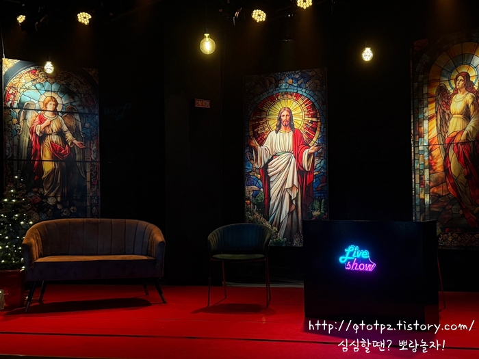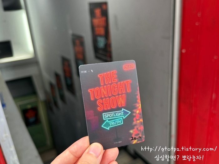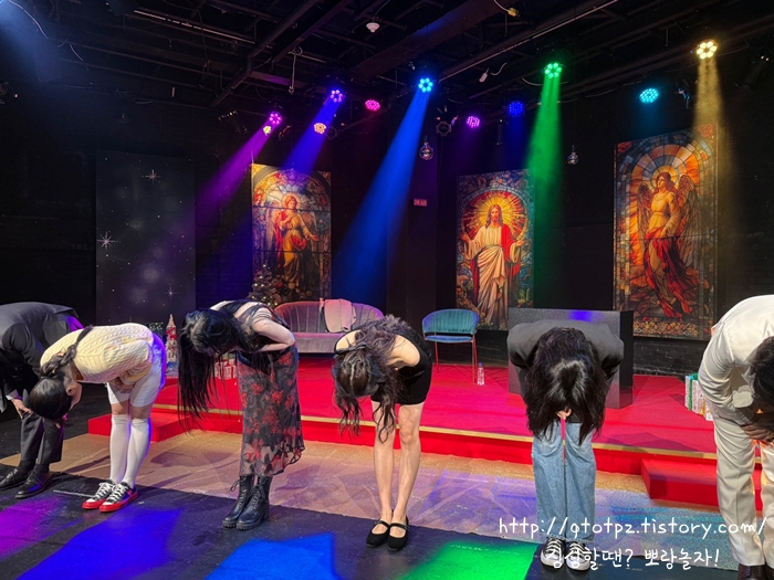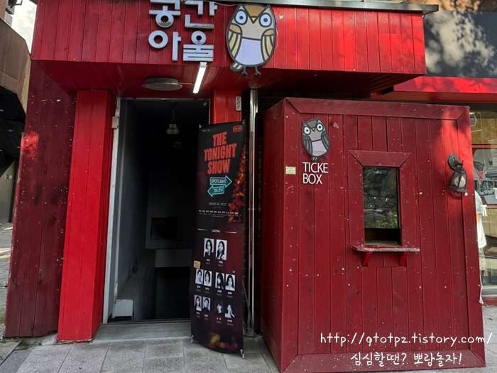 연극 <더 투나잇 쇼> 보고 왔습니다. 대학로 공간아울 소극장에서 올리고 있어요. 혜화역 1-2번 출구로 나오면 길가에 있어 어렵지 않게 찾을 수 있었습니다. 티켓부스는 밖에 있는 것 같았지만 힝 속았지! ㅋㅋ 한 층 내려가면 우측에 있습니다. 최근 폭우에 폭염... 서로 힘들어서 그런 건진 원래 쭉 이런 건진 모르겠지만 극장 밖 사람이 없더라도 밑으로 쭉쭉 내려가봅시다. 거기서 좌측으로 한 번 더 내려가면 객석으로 갈 수 있었습니다.