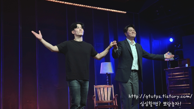두 배우가 극을 꽉 채우는 느낌이 너무 좋았습니다. 마이클에 윤석원, 데이에 정동화 배우님이었는데 제가 윤석원 배우만 타 작품(뮤지컬 <말리>)에서 본 적 있거든요. 그때는 조연의 아빠 역할이라 존재감이 도드라지진 않았는데 이렇게 2인극으로 보니 참 색다르고 배우는 배우다! 싶었습니다. 안 까먹을 것 같아요.