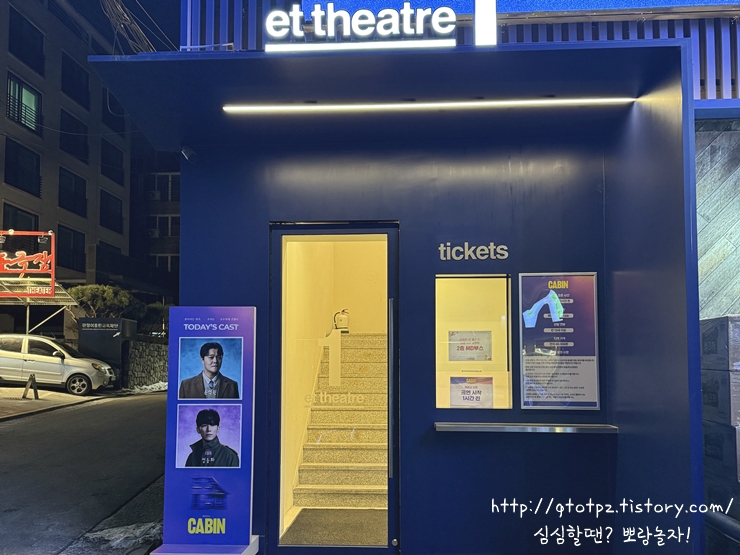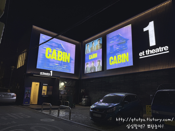 이티 씨어터 원(et theatre 1)에서 올라오고 있는 뮤지컬 캐빈(CABIN)을 보고 왔습니다. 도착해서 보니 커튼콜데이더라고요. 커튼콜은 물론이고 빈무대도 촬영 안 되는 극이 많아서 기대도 안 했는데 커튼콜데이라니! 커튼콜데이 주면 고맙더라고요. 상대적으로 촬영하느라 배우들에게 박수를 못 치는 것이 좀 그렇습니다만, 요즘 손에 스마트폰 없는 사람이 없는데 조금 답답한 느낌도 있어요. 암튼! 고마운 마음으로 촬영은 했는데 초점을 잘 못 잡아서 퀄리티가 좋지 않아요. 이럴 수가. ㅠㅠㅠㅠㅠㅠ